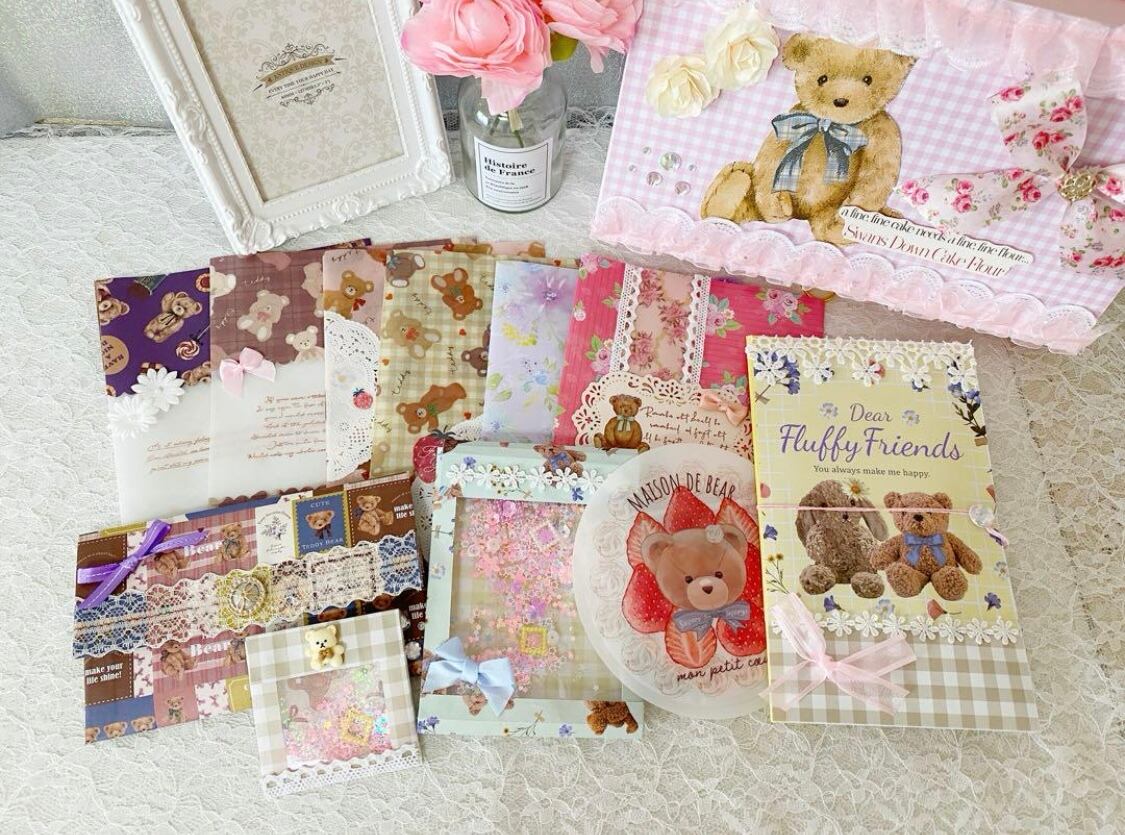 お花やリボン・レースで装飾したくまちゃんボックスに色々な紙ものを詰めました。