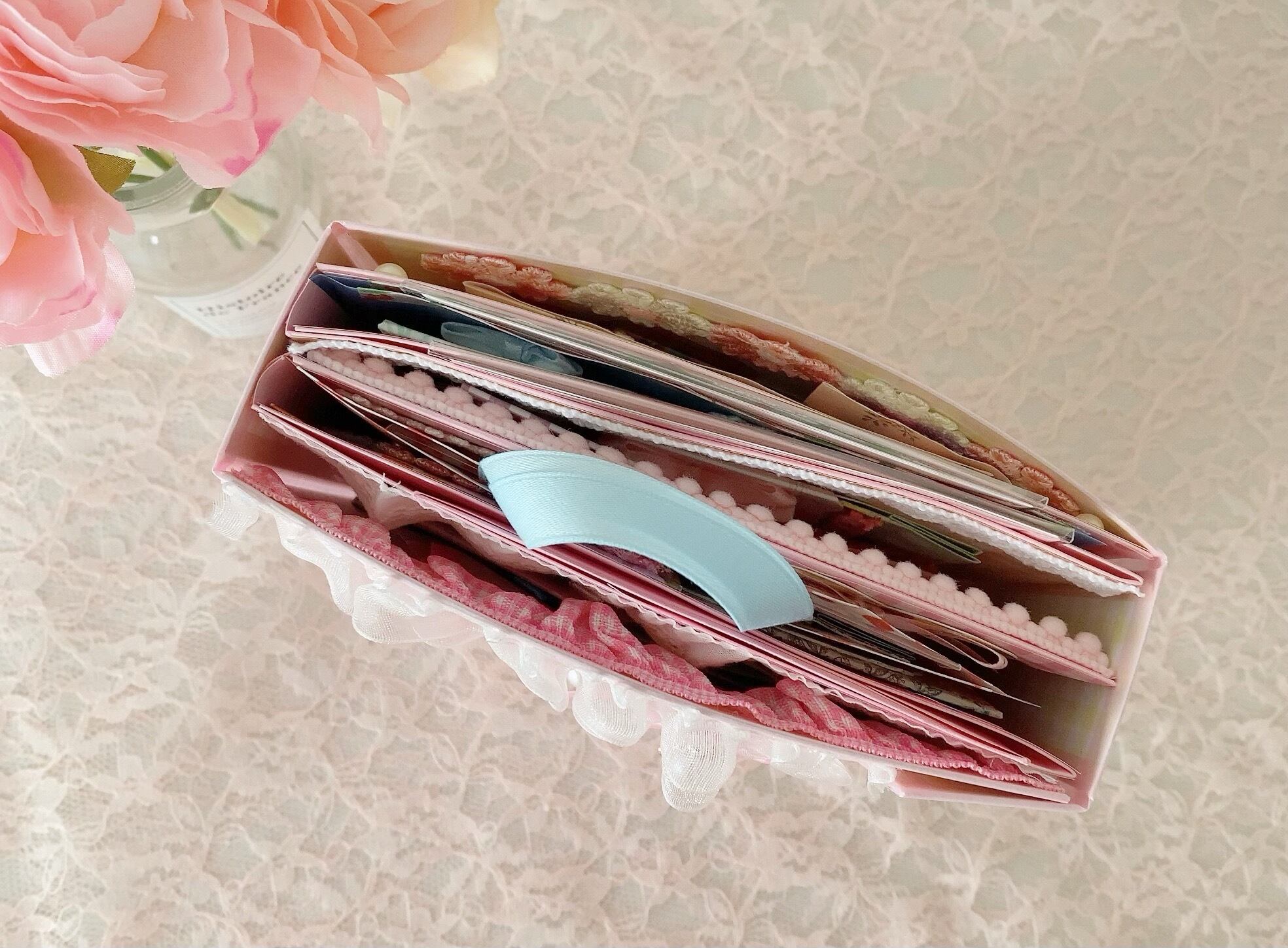 中に入ってる封筒には、メモやステッカー・シール・コラージュ素材・ペーパーなどが入っております